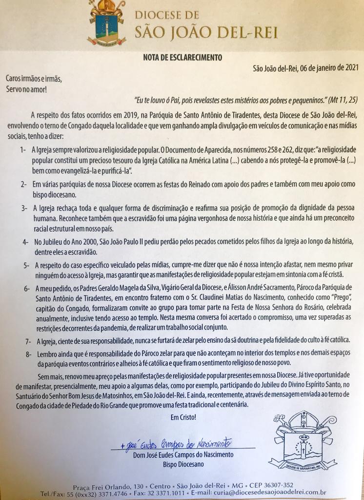 A respeito dos fatos ocorridos em 2019, na Paróquia de Santo Antônio de Tiradentes, desta Diocese de São João del-Rei, envolvendo o terno de Congado daquela localidade e que vem ganhando ampla divulgação em veículos de comunicação e nas mídias sociais, tenho a dizer: