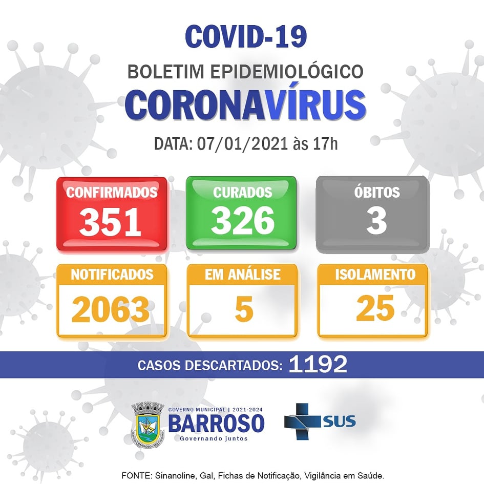 Mais 13 barrosenses foram diagnosticados com o novo coronavírus e mais 14 pacientes se recuperaram da doença. Assim sendo, os números de casos confirmados em Barroso chegaram a 351 e o de curados subiu para 326.