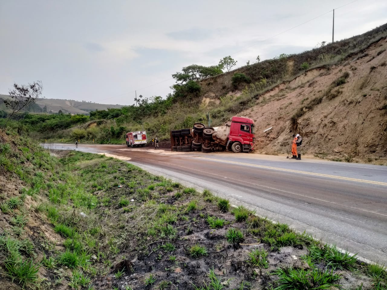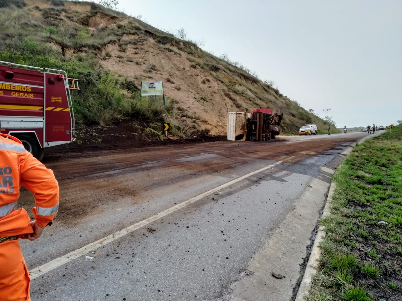 Ele informou as equipes de policiais militares e bombeiros que trafegava pela referida rodovia quando um veículo à sua frente freou bruscamente tendo mesmo que para evitar a colisão adentrou a contramão perdeu o controle vindo a chocar-se contra um barranco em ato contínuo a carga de minério derramou se espalhando esse pela pista prejudicando o tráfico de veículos; as equipes acionaram o guincho que ficou responsável pela remoção do veículo; a empresa siderúrgica pela retirada da carga e os bombeiros efetuaram a limpeza e espalharam serragem para evitar novos acidentes na rodovia.