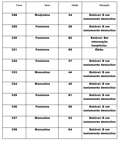 Os novos casos registrados nesta quarta se tratam de cinco homens e cinco mulheres. Todos se encontram estáveis e em isolamento domiciliar. Confira na tabela abaixo o perfil dos pacientes.