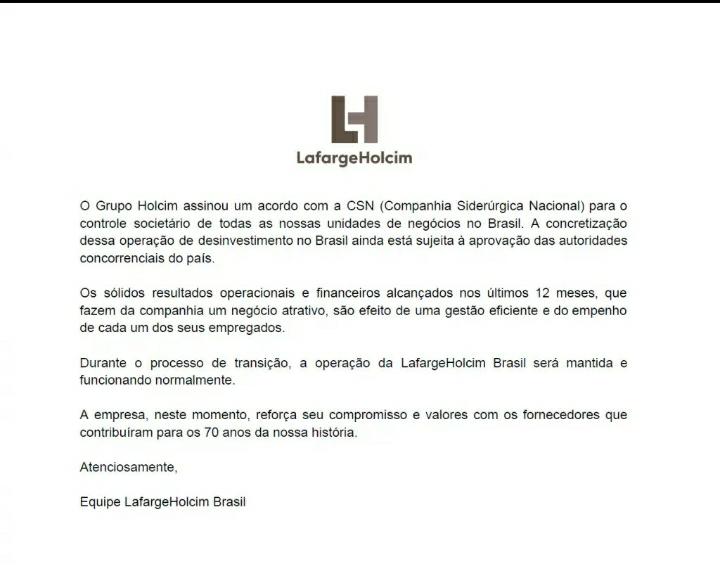 A CSN está nos detalhes finais de negociação para a compra dos ativos da cimenteira Holcim (antiga Lafarge Holcim) no Brasil. O processo de venda é coordenado pelo Itaú BBA.