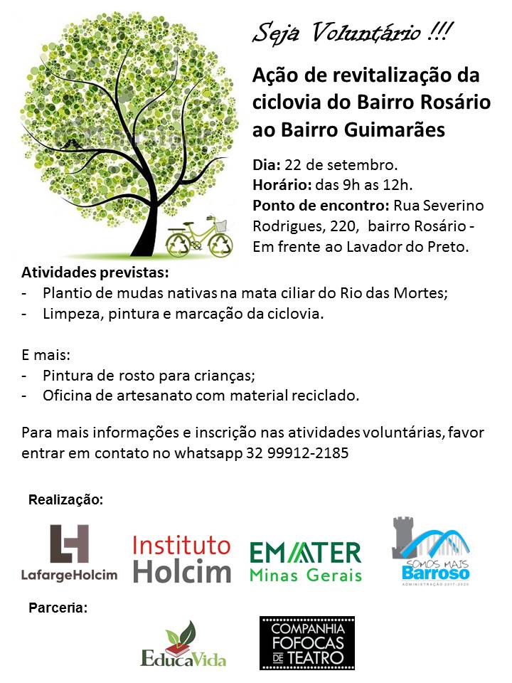 Em comemoração ao Dia da Árvore, a LafargeHolcim e o Instituto Holcim, em parceria com a Prefeitura Municipal de Barroso e a Emater, realizarão neste sábado (22) uma ação de voluntariado para revitalizar a ciclovia que liga os bairros do Rosário ao Guimarães. As inscrições vão até esta sexta-feira (21).