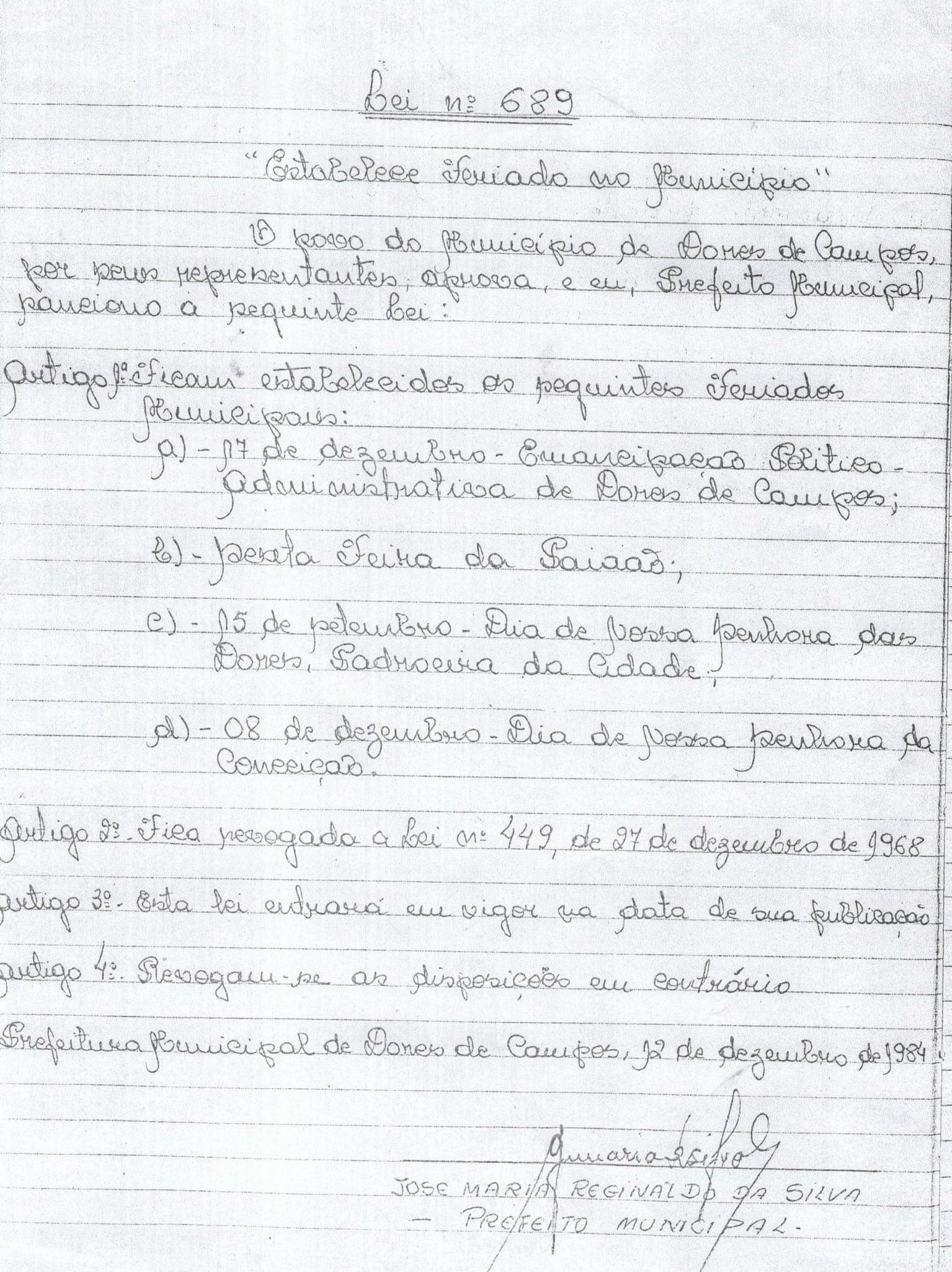 Nesta segunda-feira (17/12) Dores de Campos está completando 80 anos de emancipação política-administrativa, desta forma é feriado municipal, conforme a lei 689 de 12 de dezembro de 1984 sancionada na gestão do então prefeito José Maria Reginaldo da Silva. Conforme a nossa reportagem apurou, o feriado de 17 de dezembro foi instituído bem antes, através da lei 449 do dia 17 de dezembro de 1968, assinada pelo prefeito Hélcio Moncorvo. Alguns artigos foram modificados em 1984, mas o feriado de aniversário da cidade foi mantido.