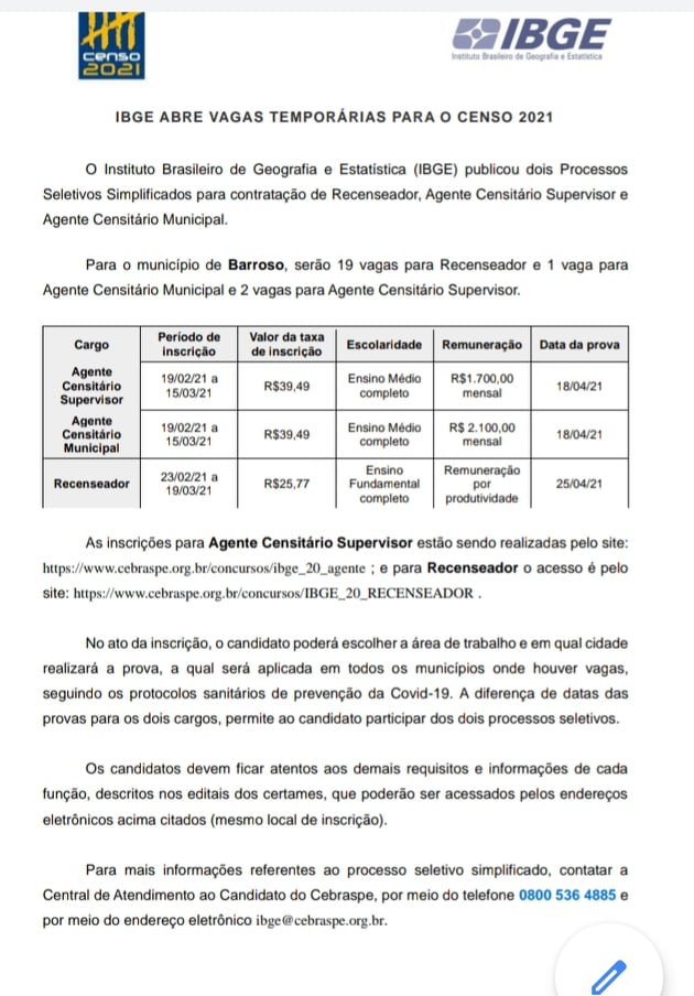 IBGE ABRE INSCRIÇÕES PARA 181 MIL VAGAS DE RECENSEADOR; BARROSO TEM 19 VAGAS