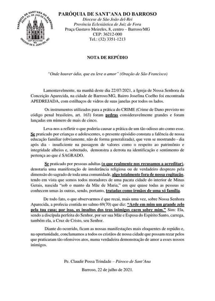 Diante do ocorrido, ficam as nossas manifestações mais eloquentes de repúdio e, na oportunidade, conclamamos a todos os cristãos de nossa cidade que possam rezar pelos que praticaram tão ofensivos atos, numa verdadeira demonstração de amor a esses nossos inimigos.