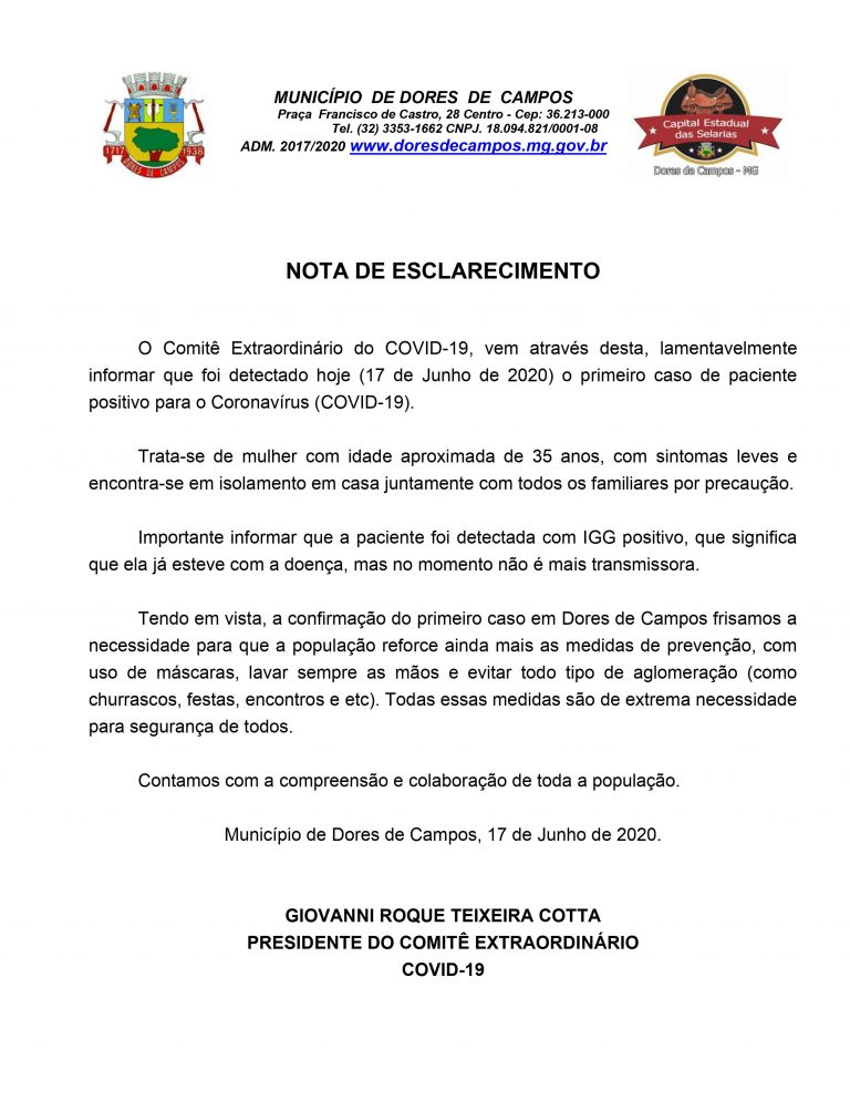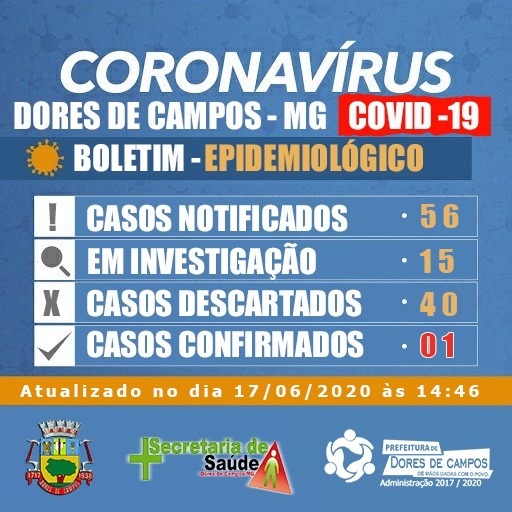 Com absoluta exclusividade que o Portal Dores de Campos apurou na tarde desta quarta-feira (17), que a Prefeitura Municipal de Dores de Campos, através da Secretaria de Saúde, confirmou o primeiro caso de coronavírus no município. Trata-se de uma mulher com idade aproximada de 35 anos, com sintomas leves da doença e que se encontra em isolamento domiciliar, juntamente com todos os seus familiares. Leia abaixo a Nota de Esclarecimento assinada pelo secretário municipal de saúde, Giovanni Cotta.