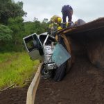 No local as equipes depararam com a colisão de um caminhão e uma carreta estando os condutores preso ás ferragens e o carona de um dos veículos já atendido pela equipe SAMU.