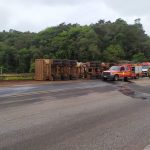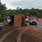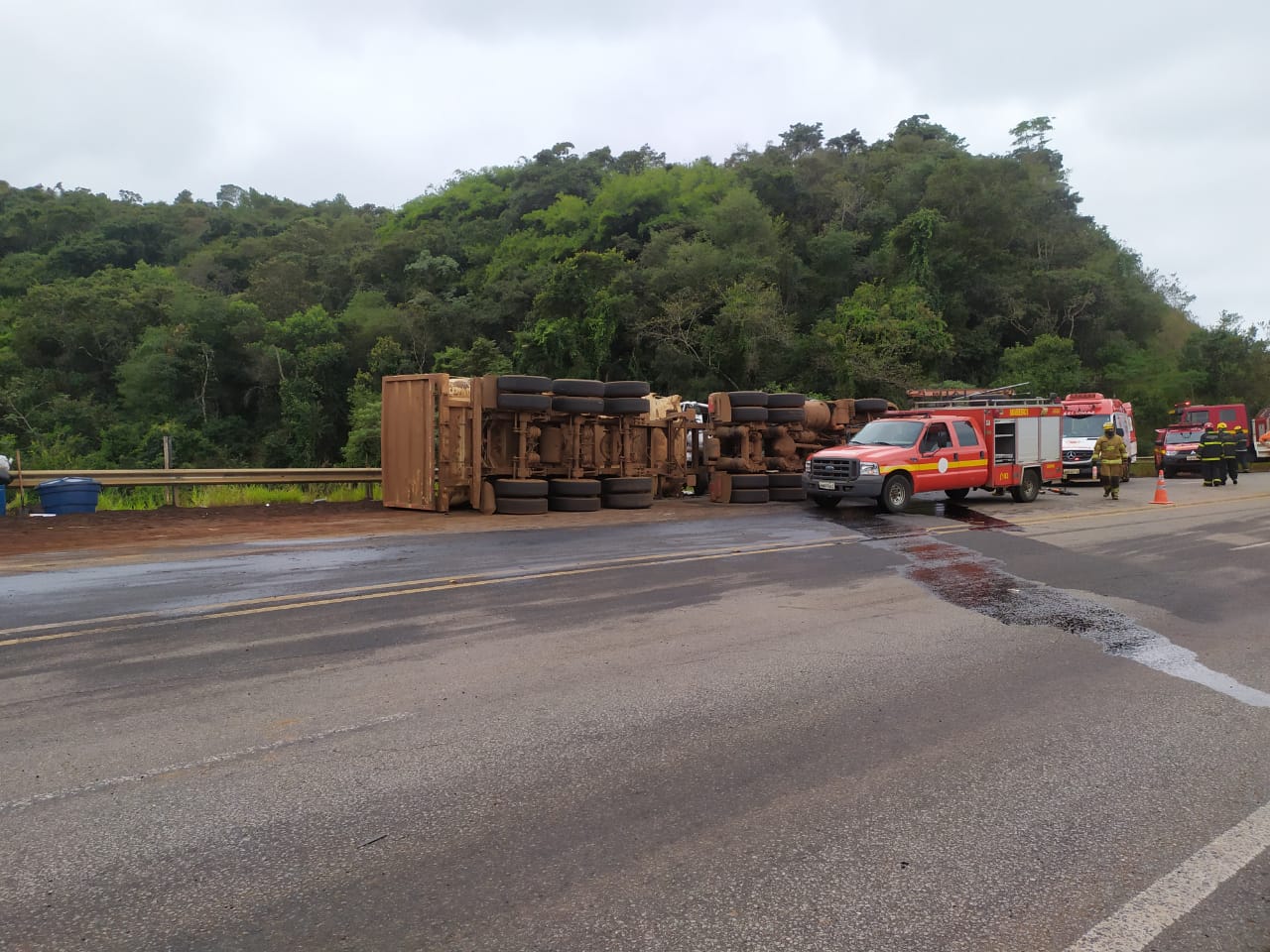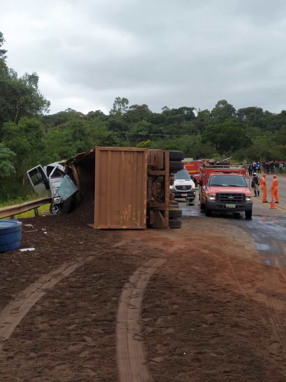 Equipes ainda no local aguardando os trabalhos da perícia, retirada dos veículos e limpeza de pista, visto a grande quantidade de óleo combustível na rodovia.