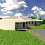 O projeto conta com uma área anexa destinada a banheiros públicos, cozinha, depósito, sala de catequese/reunião e garagem.