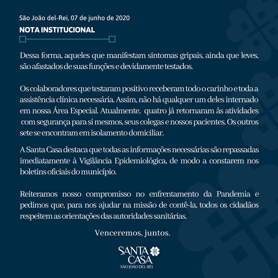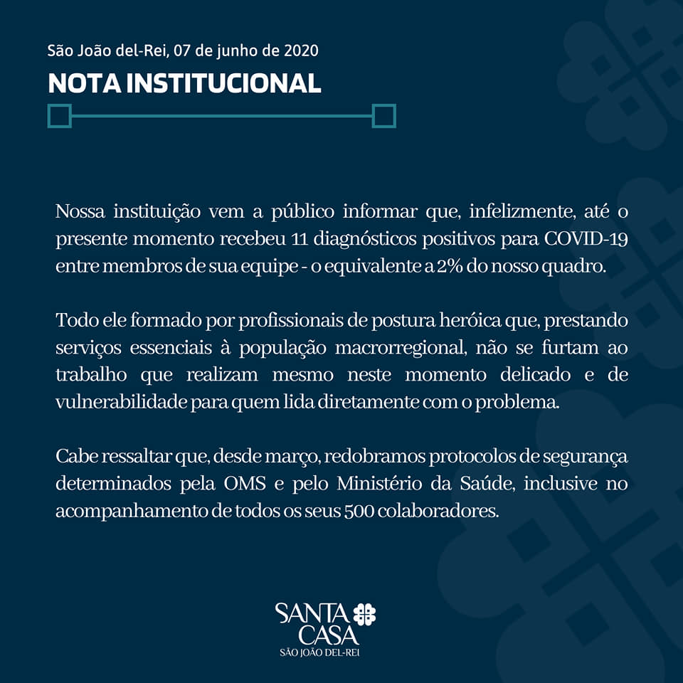 A Santa Casa de São João del Rei, um dos principais hospitais mais atuantes na região, na luta contra o Coronavírus, emitiu uma nota neste domingo (07), na qual afirma que 11 integrantes de sua equipe, o que equivale a 2% dos que estão na linha de frente, testaram positivo para o Novo Coronavírus.