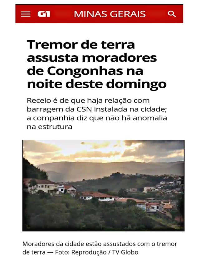 A Defesa Civil de Congonhas foi acionada após relato de “terremoto” que teria ocorrido no município da região Central de Minas Gerais entre as 21h30 e 22h da noite de domingo (15). Agentes do órgão estão, na manhã desta segunda-feira (16), na barragem Casa de Pedra, pertencente à Companhia Siderúrgica Nacional (CSN), realizando vistorias. Militares do Corpo de Bombeiros também estão no local.