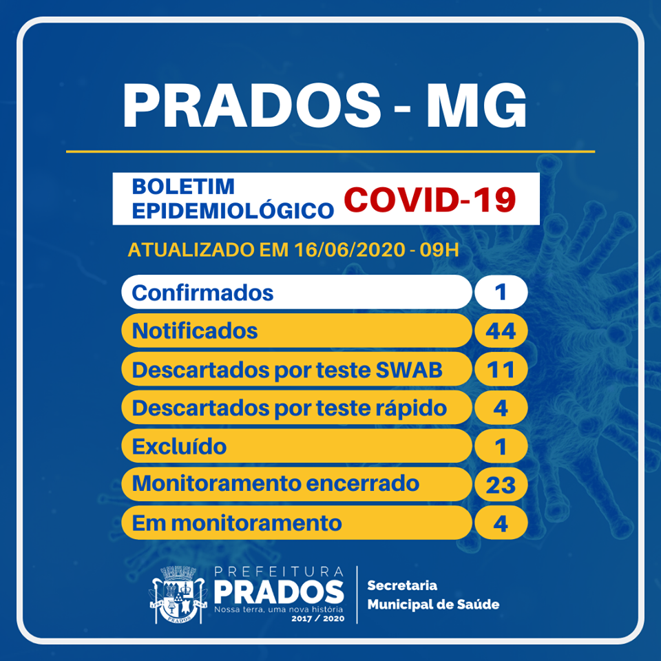 Em novo boletim divulgado nesta manhã, Prados aparece com 44 notificações, 15 casos descartados por exame, 27 casos suspeitos (dos quais, 4 estão em monitoramento), e 1 caso confirmado.