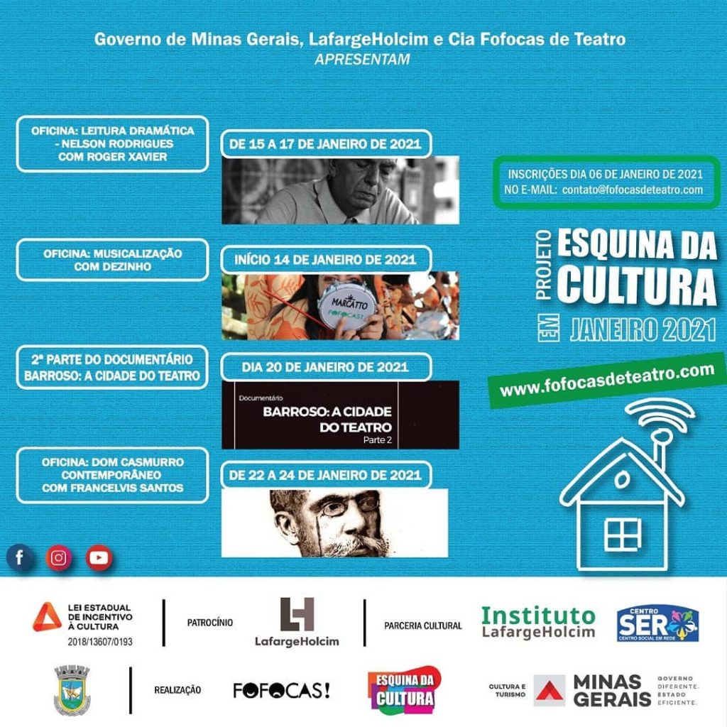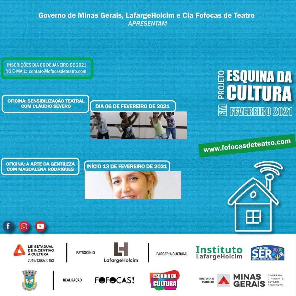 Esta atividade faz parte do Projeto Esquina da Cultura que é uma realização da Cia Fofocas de Teatro através da Lei Estadual de Incentivo à Cultura do Governo de Minas Gerais com o patrocínio da LafargeHolcim. O projeto também conta com a parceria do Centro SER, da DM Prod e do Instituto LafargeHolcim.