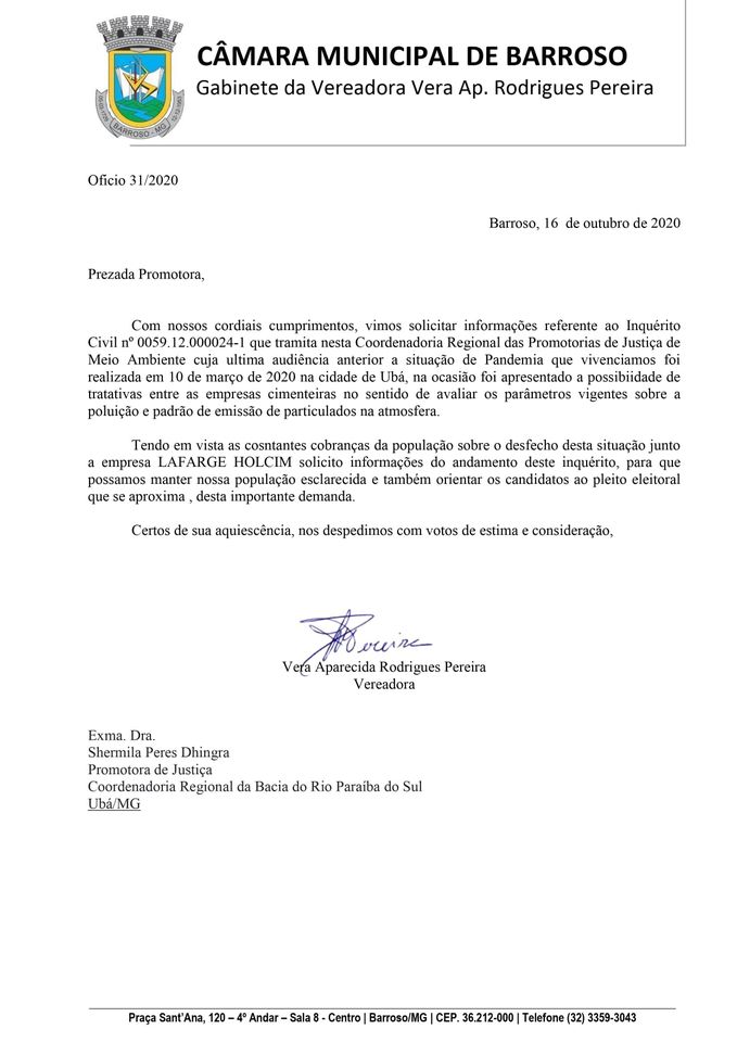 E O TRABALHO CONTINUA ….. ontem participei de uma reunião virtual com a Coordenadoria Regional de Meio Ambiente da Promotoria Pública de Ubá , com representantes da empresa Lafarge Holcim e a dedicada procuradora da Câmara Municipal Drª Tassia Velho . Esta reunião é mais uma etapa da minha luta nesta legislatura sobre os transtornos causados pela poluição ambiental. Além da Audiência Pública em 2019, este ano ocorreram três reuniões presenciais, em Ubá, com a Promotora e esta ultima no formato virtual, espero que o trabalho tenha continuidade e empenho por parte do Executivo e dos novos vereadores .